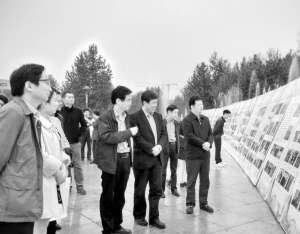 近日,川汇区组织法院、检察院、司法局等法学会会员单位,在行政新区广场开展了“平安建设宣传月”宣传活动,向群众免费发放了平安建设环保手提袋和宣传扇,为推进平安建设工作营造了良好舆论环境。图为川汇区主要领导在观看宣传板面。田竞 摄