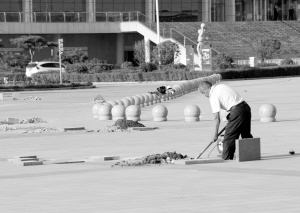 昨日,一名工人正在市体育中心内维修路面。市体育中心是市民休闲健身的最佳场地,为了给市民营造一个良好的锻炼环境,该中心适时对损坏路面、健身器材等进行维护。记者 沈湛 摄