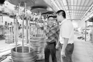 在不锈钢线材生产车间,一台台拉丝机如同一只只桑蚕一样吐出一道道丝线。经过生产流程处理后的线材,被输送到自动打包机流水线上打包成规格统一的成品。郭志强告诉记者,这台由公司自主研发的自动化线材打包机,在行业内还是首创,有完全的知识产权。