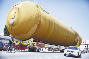 洛杉矶:运送超级航天燃料箱 这是5月21日在美国洛杉矶拍摄的航天燃料箱ET-94。ET-94是美国航天飞机外部燃料箱,长约47米,直径8.382米。21日零时,这枚空重约29.48吨的超级燃料箱从洛杉矶玛丽安德尔湾码头出发,18小时后运抵洛杉矶加州科学中心。燃料箱将在加州科学中心进行展览。新华社发