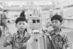 5月22日,第16届中国哈尔滨国际装备制造业博览会开幕。本届展会以“智能制造、转型升级、创新发展”为主题,涵盖节能环保、新能源技术、新材料、新能源汽车等十几大类近万种产品。图为两名小朋友在参观博览会上展出的智能机器人手臂。