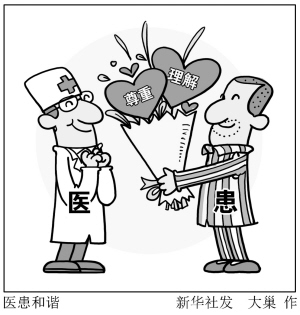 一张医生瘫坐在地上喝葡萄糖的照片让人感动,一张患者手术前叮嘱家人不得为难医生的字条让人心酸……在连续诉诸媒体的暴力伤医事件之后,两个细节引发公众动容。跳出暴力伤医的怪圈,还给医生应得的尊重与理解,让医患关系多一份和谐,成为社会的共同期待。新华社发