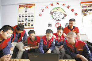 5月26日,张家口惠村淘商贸有限公司董事长赵帅军(中)同团队一起研究工作。张家口市宣化区“85后”大学毕业生赵帅军和白博于2014年成立一家立足于乡村的电商企业“惠村淘” 。