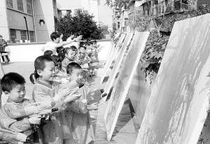 为庆祝“六一” 儿童节,丰富孩子们的业余生活,增强其动手能力,昨日,周口市直幼儿园举办了艺术节。此次艺术节以创意美术游戏为主题,让孩子在玩的同时得到艺术启发。图为小朋友们在“喷画”。