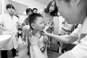 7月17日,在河南中医学院第一附属医院,医生在给一名小朋友贴敷中药。当日是夏季入伏第一天,一些市民来到当地中医院或诊所贴“三伏贴”,用中医贴敷疗法防病治病。新华社记者 李博 摄