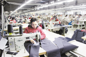 昨日上午,项城市产业集聚区庄吉服装公司生产车间内,工人正在紧张赶制订单服装。据了解,该公司生产项目总投资5亿元,占地138亩,目前已全部投产,年可加工各类服装1000万件,吸纳近3000人就业。王洁石 摄