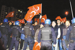 荷兰禁止土耳其外长飞机入境引发抗议 3月12日,在位于安卡拉的荷兰驻土耳其大使馆外,民众举行抗议活动。荷兰政府11日取消土耳其外长恰武什奥卢班机在荷兰的着陆权。荷兰外交部发表声明称,取消土外长班机着陆许可是出于“公共安全方面的原因”。此举引发土耳其人的不满和抗议。新华社发