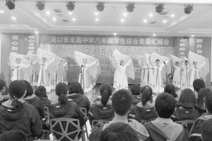 3月10日,文昌中学八年级综合素质展演在文昌中学多功能会议室举行,8年级全体学生及家长约1500人参加并观看演出。演出由学校社团老师和学生全程主持,共有18个社团的300多名学生参加汇报演出。学生家长、周口市文昌小学校长李继龙观看3个小时演出后,对演出成功给予高度称赞,“文昌中学办学理念先进,孩子们德智体美艺全面发展,探索出了一条中国基础教育改革的出路,自己的孩子放在文昌放心,也感恩文昌的教育模式成就了孩子的人生。”不少家长情不自禁地在文昌家长微信群里留言:为孩子点赞!为文昌中学点赞!图为演出现场。记者 刘彦章 摄