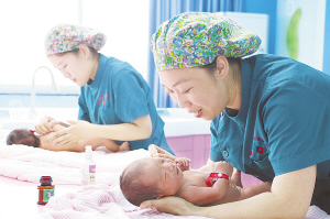 5月12日是国际护士节。当日,我市上万名“白衣天使”依然坚守在各自的工作岗位上。图为项城市第一人民医院妇产科护士正在为新生儿洗浴按摩。王洁石 摄