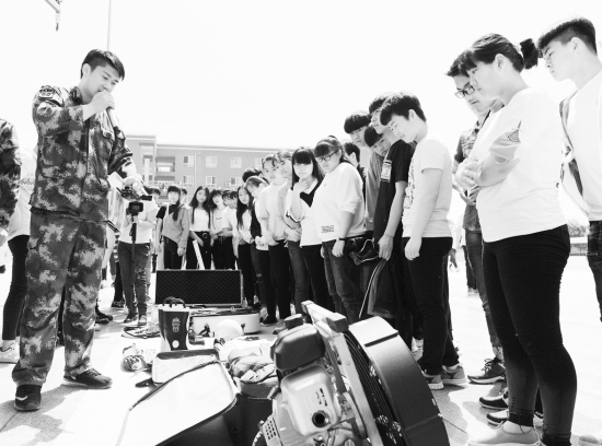 为做好第九个“全国防灾减灾日”宣传教育工作,切实提高淮阳县广大中小学师生防空防灾的意识和能力, 5月12日,淮阳县2017年“5·12”中小学防空防灾应急疏散演练活动在县实验高中举行。图为消防人员向师生讲解消防用品的用法。 马建伟 摄