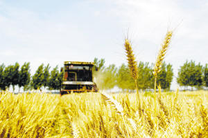 5月29日上午,商水县郝岗乡东洄村的一块麦田里,一大型收割机正在收割小麦。连日来,我市小麦陆续成熟,广大农民抢抓晴好天气开展抢收,确保小麦颗粒归仓。吕耀光 摄