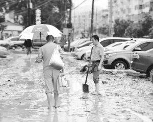陕北地区持续降雨 防汛形势严峻 7月27日,在陕西省绥德县城,市民经过满是淤泥的路面。陕西省榆林市自7月25日起普降暴雨,部分地区形成严重洪涝灾害,其中绥德县和子洲县受灾最为严重。记者从陕西省防汛抗旱总指挥部办公室了解到,7月25日8时至26日7时,陕西省有74个县(区)降雨,陕北中北部出现区域性大暴雨,其中子洲县水地湾234毫米,绥德县赵家砭210毫米。据了解,陕北地区的降雨将持续到7月29日,防汛形势严峻。新华社发