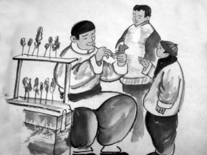 转盘底下,有一个大抽屉。老甜头拉开。抽屉里有一块大理石,是用来画糖人的。与吹糖人相比,画糖人要简单一些。用一个精制的小铜勺,舀上半勺糖稀,飞快地浇到大理石上。待糖稀稍微冷却,用小刀刷刷画出糖人形象,或人物,或动物,或花鸟,或虫鱼。待糖稀再冷却,用小刀贴住大理石把糖人铲下来。再贴上一根小竹签,就可以送给孩子吃了。这就叫画糖人。