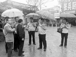 近日,项城市公安局党组成员带头到辖区运输企业检查动态监控值班记录、处罚台账和驾驶人定期培训等,确保道路交通安全、畅通,减少和预防道路交通事故的发生。图为10月1日,该局副局长王贵峰带领交警大队等部门负责人冒雨在周运集团项城市分公司检查工作。 记者 徐如景 通讯员 牛天慧 摄