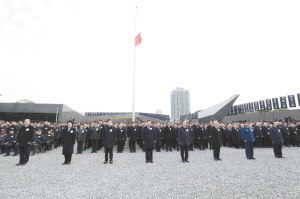 公祭仪式在侵华日军南京大屠杀遇难同胞纪念馆举行。纪念馆集会广场庄严肃穆,现场国旗下半旗。广场西侧巨大的“灾难墙”上,灰黑的底色映衬着“南京大屠杀死难者国家公祭仪式”14个白色大字。约1万名各界代表胸前佩戴白花,静静肃立。
