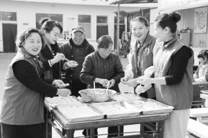 12月22日上午,扶沟县阳光公益协会的6名志愿者带着肉、菜和面粉,来到该县福安康养老院,包饺子、演节目,送去温暖和快乐。图为志愿者和养老院的贫困老人一起包饺子。谷志方 李永超 摄