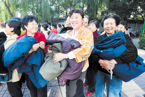 10月15日,市民排队等待捐献棉衣被。 当日,北京市东城区清水苑社区200多名居民为四川灾区捐献了全新的棉衣被、八成新的电脑电视等。据悉,北京全市18区县在辖区内繁华街道和居民密集区设置宣传场地,开展为四川灾区捐赠活动。 新华社记者 李文 摄