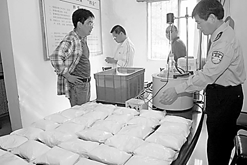 禁毒支队民警现场收缴的105公斤K粉制毒工具。10月13日,湖北黄石市警方破获一起特大制贩毒案,抓获涉案人员9名,现场收缴K粉105公斤,为黄石建市以来最大一起制贩毒案。 于风 摄