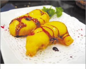 6.烧热1碗油,放入香蕉牛肉卷炸至金黄色,捞起用厨房纸吸干余油。