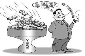近日,重庆一镇长为父亲庆贺70大寿,办了280桌宴席。因人数太多,有人等了三轮仍没入席。(10月19日《重庆晚报》)