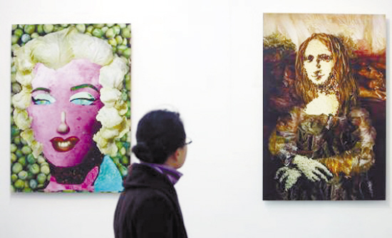 11月26日,观众在参观展览。 “蔬菜博物馆”摄影展日前在北京开展,年轻艺术家桔多淇用粮食、蔬菜等食物拼贴成世界名画,并拍摄成照片,其中包括《蒙娜丽莎》、《玛丽莲·梦露》和毕加索的《梦》等作品。 新华社发