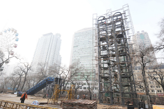 正在建设中的“冰城堡”电梯(11月26日摄)。在12月下旬举行的哈尔滨首届迪士尼冰雪游园会暨哈尔滨第35届冰灯艺术游园会上,4部电梯将首次在冰城堡上投入使用。其中,两部为垂直运送高度6米的扶梯,两部为垂直运送高度达18米的观光电梯。目前,电梯的钢结构主体基本完工,12月初将与冰建筑“组合”。 新华社发