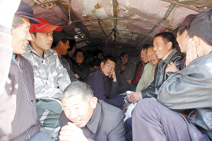 昨天上午,一名下肢残疾的男子开着一辆车篷顶上载满货物的农用三轮车在市区交通西路上飞驰,直奔闹市区,被市交警支队二大队民警拦下(右图)。经查实,该三轮车上共载有19人(下图)。 晚报记者 朱海龙 摄