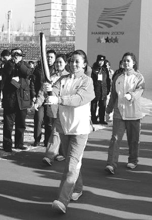 12月10日,世界冠军杨扬手握火炬走向主席台。当日,第24届世界大学生冬季运动会火种采集仪式在哈尔滨工业大学体育场举行,曾担当北京奥运会火炬手的杨扬在火种盆中引燃了首棒火炬并完成了火种交接。第24届世界大学生冬季运动会将于2009年2月18日至28日在哈尔滨举行,这是我国历史上举办的规模最大、人数最多、水平最高的世界综合性冬季运动会,参会的国家和地区代表团有望超过50个。