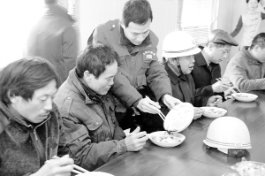 “今儿中午咱休息”。工地上负责烧饭的闫守祥、刘芳玲如是说。他们俩负责50多个建筑工人的饮食,平时,每天上午8时30分左右就开始准备午饭,买菜、做菜、炖汤、蒸米饭,忙得不可开交。冬至这天,他们却享受了难得的清闲。