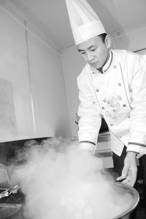 来自周口饭店的大厨张伟亲自掌勺,在上午11时许娴熟地下饺子。闫守祥和刘芳龄只负责打下手,准备点吃饺子用的调料。
