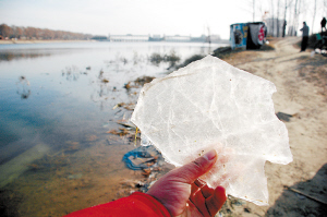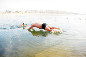 天气越冷,越能享受到冬泳的乐趣。昨天,虽然沙河里结了厚厚的冰(右图),冬泳爱好者却冒着刺骨的寒风,兴高采烈地在沙河里“泳”斗严寒(上图)。