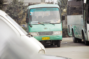 旁边一人无意向记者透露:“这辆绿色客车今天很忙,已经跑了好几趟了。”他又说,其他跟这辆车一样的绿色客车都没动,不知是不是这些不动的绿色客车都通不过检测。
