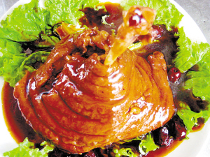 4.如果想要这道菜赏心悦目,在棕红色的肘子下垫上一层生菜,再在肘子上撒些香菜叶立刻会使你心情愉悦起来。
