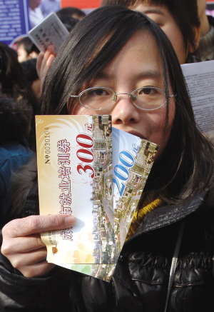 1月12日,在四川省科技馆南门广场,成都市锦江区的唐文吟领到了500元的就业培训券。当日,成都市正式向315名失业返乡农民工、2008届以前未就业大中专毕业生和因企业停产或者经济性裁员而新增的就业转失业等三类人员,发放了价值15.75万元的就业培训券。这些持券者可以在2009年12月31日前,在政府选定的173家定点培训机构中自主从110多项专业技能培训中选择自己要参加的培训专业。预计全市将向2360余人发放价值118万元的就业培训券。