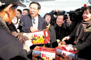1月14日,浙江衢州市委书记孙建国在杭州帮助橘农推销柑橘。当日,为了帮助衢州橘农顺利度过“销售寒冬”,浙江省农业厅和衢州市政府在杭州的浙江农展馆广场举办衢州柑橘杭州专场促销会,衢州市委书记孙建国带领百名橘农到现场叫卖柑橘。