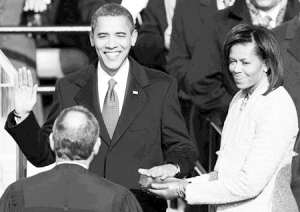 在美国最高法院首席大法官约翰·罗伯茨的主持下,奥巴马手按由米歇尔·奥巴马捧着的圣经,庄严宣誓。但在第一句就将词序弄错,不得已又重复了一次。不过,奥巴马及夫人米歇尔的表情非常镇定。