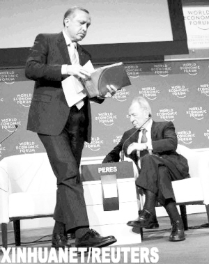 当佩雷斯发言时,他转向埃尔多安,高声为以色列的行为辩护。他用手指着埃尔多安说,如果伊斯坦布尔遭遇火箭弹袭击,土耳其会和以色列做出同样回应。