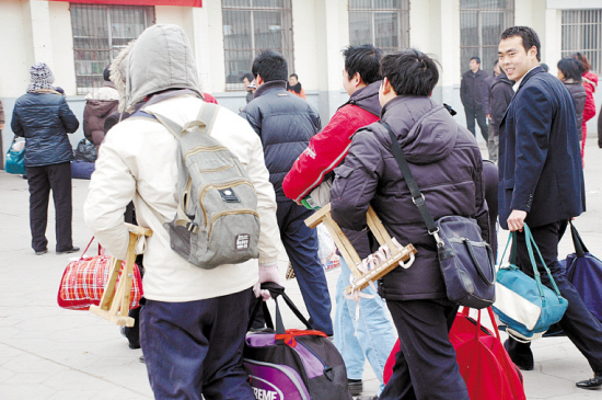 昨天上午,在周口火车站,不少乘客携带着小马扎登上开往广州的列车。 据了解,由于民工及学生陆续返程,致使我市发往北京、广州的火车出现“一座难求”的现象。不少乘客表示,在火车上找不到座位,自带小马扎是个不错的选择。 晚报记者 朱海龙 摄