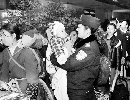 2月1日,一名女警队员在候车室的检票口帮助旅客抱小孩。日前,重庆铁路公安处女警突击队在重庆菜园坝火车站开展温情服务活动,如为老人提行李、为带小孩旅客提供帮助等,受到旅客称赞。新华社发