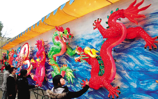 2月4日,苏州市民参观安装完成的大型“九龙壁”宫灯。当日,由九条飞龙组成的大型“九龙壁”宫灯在苏州制作完成,将在元宵节期间展示,供公众参观。这组宫灯出自苏州市东吴灯彩雕塑工艺厂的灯娘之手,长12米、高4米,内部骨架为钢质,外部面料为丝绸和绢纱,九条飞龙栩栩如生。 新华社发 朱桂根 摄