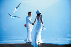 2月7日,一对情侣在海埂大坝以红嘴鸥为背景拍婚纱照。自从1985年冬天,大批红嘴鸥从西伯利亚南迁到昆明,以滇池为中心的滇中高原湖泊水域成为它们每年必到的越冬场所。如今,红嘴鸥已成为昆明的一张“名片”,结婚的新人大多要到海埂拍婚纱照、喂红嘴鸥。