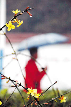 俗语说“春雨贵如油”。昨天,盼望已久的一场甘霖终于姗姗而来,全市都笼罩在蒙蒙春雨中。这对久旱的周口来说无疑是份最好的元宵节礼物,但让人感到遗憾的是这场雨有点儿小。图为昨天在周口人民公园,一打伞的路人从挂着晶莹雨珠的迎春花前走过。