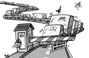 收费员去吃饭,关掉了两个收费通道中的一个,结果导致2月7日11时陕西神木西沟收费站上行线堵死两公里,200余辆车留置204省道。事后据收费站值班领导介绍,春节期间收费员轮班不太正常,以后将加强值班纪律,尽快恢复正常上班。(2月9日《环球时报》)