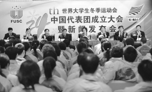 2月12日,第24届世界大学生冬季运动会中国代表团在哈尔滨市成立,代表团共有359名成员,其中运动员193人。图为成立大会现场。