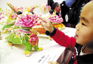 2月13日,中国非物质文化遗产传统技艺大展在北京举行,色彩艳丽的花馍作品吸引了一名小男孩。该展览从2月9日至2月23日在北京农展馆举行,汇集了一大批国家级和省级非物质文化遗产名录的传统技艺、传统美术和“中华老字号”项目,并由众多国家级和省级非物质文化遗产项目代表性传承人、中国工艺美术大师以及一批民间艺人在展馆现场为观众展示精湛技艺。新华社发