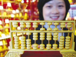 2月16日,在苏州一家金店,工作人员展示“金算盘”。近日,苏州一家金店里用千足金制成的“金算盘”吸引许多顾客的目光。“金算盘”寓意精打细算,勤俭持家,成为一些长辈馈赠子女的婚嫁礼品。新华社发