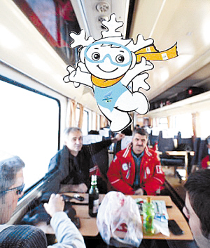 2月17日,从哈尔滨市开往帽儿山、亚布力滑雪场的N11次列车,用大冬会会徽、吉祥物和冰雪运动剪纸作品装饰一新,体现出浓浓的大冬会味道。第24届世界大学生冬季运动会将于2月18日在哈尔滨市开幕,雪上赛事将在帽儿山、亚布力滑雪场举行。这是车厢中的大冬会吉祥物装饰。