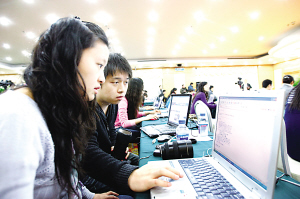 2月19日,各媒体记者在铁道部新闻发布会上采访。当日铁道部在北京举行新闻发布会,介绍春运情况。为期40天的铁路春运工作将于2月19日全面结束。铁道部数据显示,今年春运期间共运送旅客1.92亿人次,日均发送量480万人次,同比增长了10.6%,其中单日最高峰发送旅客592.9万人次。
