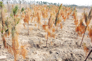 后来在这位好心市民的一再要求下,他们就找来工作人员,按常规把树坑挖深点、浇足水,希望能有奇迹发生栽活几棵,不枉那位市民的一番心意。可从目前状况看,和栽前预料的一样,500多棵湿地松全部死亡,成活下来的都是黑松。