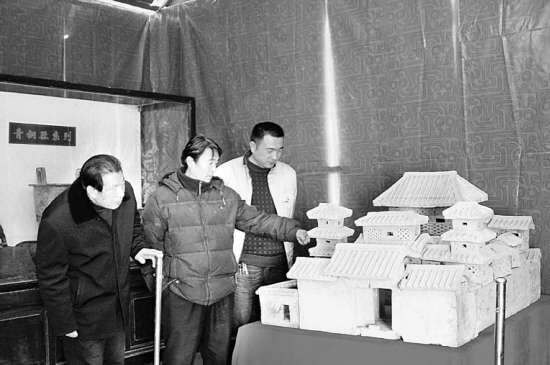 昨天,记者在淮阳太昊陵午朝门西侧看到,由市文化局主办,周口平粮台古城博物馆承办的“全国重点文物保护单位——平粮台古城遗址古文化精品展”展厅已在这里布展到位。在即将开始的2009年中国·淮阳羲皇故都朝祖会期间(农历二月初二至三月初三),这些人类文明的古文化精品将与游客见面。图为参展的古陶器系列代表展品“中原第一陶院落”。晚报记者 杜欣